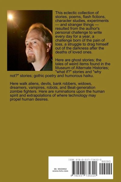 This eclectic collection of stories, poems, flash fictions, character studies, experiments - and stranger things - resulted from the author's personal challenge to write every day for a year, a challenge born of the pain of loss, a struggle to drag himself out of the darkness after the deaths of loved ones. Here are ghost stories; the tales of weird items found in the Museum of Alternate Histories; "what if?" stories and "why not?" stories; gothic poetry and humorous haiku. Here walk aliens, devils, bank robbers, widows, dreamers, vampires, and Beat-generation zombie fighters. Here are ruminations upon the human spirit and extrapolations of where technology may propel human desires.
