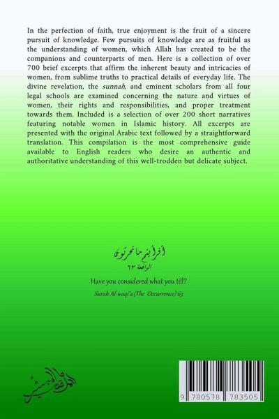 In the perfection of faith, true enjoyment is the fruit of a sincere pursuit of knowledge. Few pursuits of knowledge are as fruitful as the understanding of women, which Allah has created to be the companions and counterparts of men. Here is a collection of over 700 brief excerpts that display the inherent beauty and intricacies of women, from sublime truths to practical details of everyday life. The divine revelation, the sunnah, and eminent scholars from all four legal schools are examined concerning the nature and virtues of women, their rights and responsibilities, and proper treatment towards them. Included is a selection of over 200 short narratives featuring notable women in Islamic history. All excerpts are presented with the original Arabic text followed by a straightforward translation. This compilation is the most comprehensive guide available to English readers who desire an authentic and authoritative understanding of this well-trodden but delicate subject.