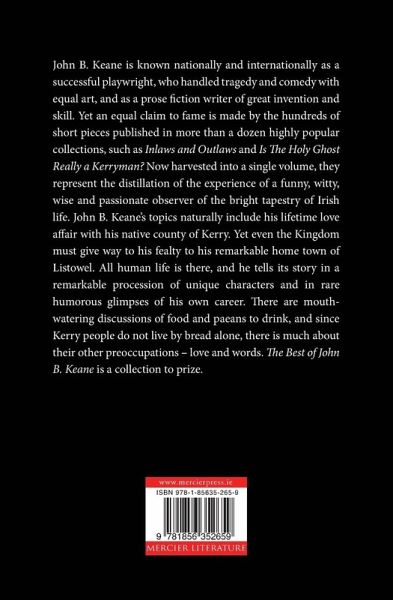 John B. Keane, one of Ireland's most prolific and respected literary figures, died on 30 May 2002 at the age of 73, after a long and difficult battle with cancer. John B. Keane was born in 1928 in Listowel, County Kerry and it was here that he spent his literary career, running a pub which provided him with inspiration for his characters and ideas. His first play, Sive, was presented by the Listowel Drama Group and won the All-Ireland Drama Festival in 1959. It was followed by another success, Sharon's Grave, in 1960. The Field (1965) and Big Maggie (1969), are widely regarded as classics of the modern Irish stage and jewels in a crown which includes such popular hits as Many Young Men of Twenty, The Man from Clare, Moll, The Chastitute and The Year of the Hiker. His large canon of plays have been seen abroad in cities as far afield as Moscow and Los Angeles. Big Maggie ran on Broadway for over two months in 1982 and The Field was adapted into an Oscar-winning Hollywood film, starring Brenda Fricker and Richard Harris, in 1991. But it was not just in his plays that John B. Keane managed to portray all aspects of humanity with both wit and truth. He also wrote many fine novels, including The Contractors, A High Meadow and Durango. Durango was adapted for the big screen, starring Brenda Fricker and Patrick Bergin. A writer of essays, short stories and letters, his humorous words live on in Celebrated Letters of John B. Keane, More Celebrated Letters, The Best of John B. Keane and The Short Stories of John B. Keane. In 1987 John B. Keane received a special award for his enduring place in Irish life and letters from the Sunday Independent/Irish Life. In that year he also won a Sunday Tribune Arts Award and in 1988 he was chosen as the recipient of the Irish-American Fund Award for Literature. In 1999 he was presented with a Gradam medal, the Abbey Theatre's highest award. He was a member of Aosdana and the recipient of honorary doctorates from Trinity College, Dublin, Limerick University and Marymount College, New York. John B. Keane remains one of Mercier's best-loved and best-selling authors.