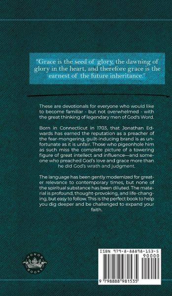 These are devotionals for everyone who would like to become familiar - but not overwhelmed - with the great thinking of legendary men of God's Word. Born in Connecticut in 1703, that Jonathan Edwards has earned the reputation as a preacher of the fear-mongering, guilt-inducing brand is as unfortunate as it is unfair. Those who pigeonhole him as such miss the complete picture of a towering figure of great intellect and influence-and someone who preached God's love and grace more than he did God's wrath and judgment. The language has been gently modernized for greater relevance to contemporary times, but none of the spiritual substance has been diluted. The material is profound, thought-provoking, and life-changing, but easy to follow. This is the perfect book to help you dig deeper and be challenged to expand your faith.