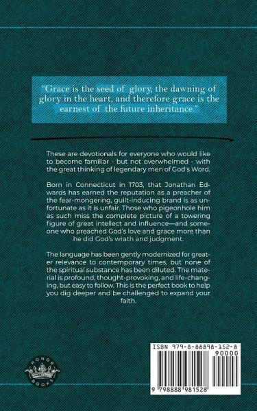 These are devotionals for everyone who would like to become familiar - but not overwhelmed - with the great thinking of legendary men of God's Word. Born in Connecticut in 1703, that Jonathan Edwards has earned the reputation as a preacher of the fear-mongering, guilt-inducing brand is as unfortunate as it is unfair. Those who pigeonhole him as such miss the complete picture of a towering figure of great intellect and influence-and someone who preached God's love and grace more than he did God's wrath and judgment. The language has been gently modernized for greater relevance to contemporary times, but none of the spiritual substance has been diluted. The material is profound, thought-provoking, and life-changing, but easy to follow. This is the perfect book to help you dig deeper and be challenged to expand your faith.