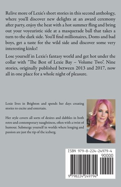 Relive more of Lexie's short stories in this second anthology, where you'll discover new delights at an award ceremony after party, enjoy the heat with a hot summer fling and bring out your voyeuristic side at a masquerade ball that takes a turn to the dark side. You'll find millionaires, Doms and bad boys, get a taste for the wild side and discover some very interesting kinks! Lose yourself in Lexie's fantasy world and get hot under the collar with "The Best of Lexie Bay - Volume Two". Nine stories, originally published between 2013 and 2017, now all in one place for a whole night of pleasure.