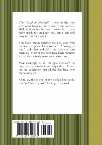The World of Sherby57 is one of the most loved blogs on the whole of the internet. Well, it is to me because I wrote it. I can't speak for anybody else. This book is a collection of the best posts from the first two years. They've mostly been rewritten so there is a point to buying the book and not just reading them online. Plus there is a new conclusion to the epic Fireheart! tale. Thrilling stuff. Read it today. Please.