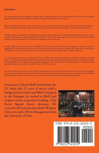 Synopsis of The Best President Money Can Buy The story begins in the poor Appalachian mining region of Eastern Kentucky using coal mining and the associated FDR New Deal electrification of the Tennessee Valley as the start point. The story evolves to the present day with the competing issues of an aging US power grid and the need for state of the art uninterruptible renewable sources of electric power. Complicating this problem is the future of Kentucky coal and the current vulnerability of existing renewable energy systems to direct interdiction by countries hostile to the United States. Leading this list of hostile countries is the People's Republic of China (PRC) who have developed an Electromagnetic Pulse (EMP) weapon targeted to interdict exposed US renewable energy facilities (A true fact by the way). The story develops as a PRC strategy to expand their current large US market for solar power panels (also a true fact), since solar power is especially vulnerable to EMP weapons. The PRC rightly concludes that given the vulnerability of the US power grid if they dominate the solar panel market they would have a means to subjugate the US to their will. The main protagonists in this story are Mr. Jamie Preston, a wealthy industrialist whose Lexington, Kentucky based company has developed an alternative renewable power source that is protected against EMP attack (a system like this does exist), and his fiancé, Ms. Jade Riley, an investigative reporter. The relationship between Preston and Riley parallels the development of the main plot. This relationship begins as an adversarial one that gradually develops into a love affair as together they discover PRC's intentions. The crime/thriller aspect of the story evolves as PRC operatives threaten Jamie's life and the lives of those closest to him. Their struggle to persevere against the odds, to include clandestine PRC operatives, a female assassin and an unscrupulous family of a US politician whose patriarch has eyes on the White House and is being bribed by the PRC comprise the sub-plots.