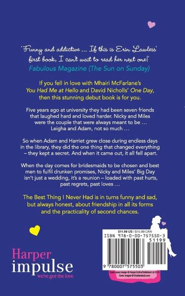 'Funny and Addictive!' Fabulous Magazine (Sun) Funny, sad and honest, if you loved David Nicholls' One Day and The Note this is the book for you. 'So much more than a love story, more of a life story.' Five years ago at university they had been seven friends that laughed hard and loved harder. Nicky and Miles were the couple that were always meant to be ... Leigha and Adam, not so much. So when Adam and Harriet grew close during endless days in the library, they did the one thing that changed everything - they kept a secret. And when it came out, it all fell apart. When the day comes for bridesmaids to be chosen and best men to fulfil drunken promises, Nicky and Miles' wedding isn't just a wedding, it's a reunion - loaded with past hurts, past regrets, past loves.... What readers are saying about The Best Thing I Never Had: 'One of the most engagingbooks I've read this year. I loved it' - Books with Bunny 'A superb debut about complicated ties, betrayal and lies, and one of my favourite books of the year' - ChickLit Club 'Friendships, trust, lies, deceit, love and so much more - a real page-turner for me' - Cosmochicklitan