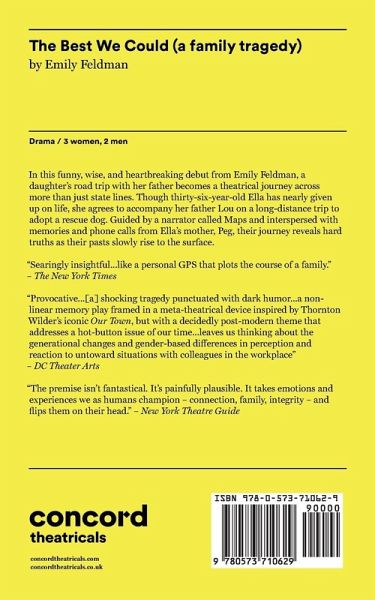 In this funny, wise, and heartbreaking debut from Emily Feldman, a daughter's road trip with her father becomes a theatrical journey across more than just state lines. Though 36-year old Ella has nearly given up on life, she agrees to accompany her father Lou on a long-distance trip to adopt a rescue dog. Guided by a narrator called Maps and interspersed with memories and phone calls from Ella's mother, Peg, their journey reveals hard truths as their pasts slowly rise to the surface.