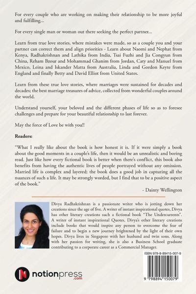 For every couple who are working on making their relationship to be more joyful and fulfilling... For every single man or woman out there seeking the perfect partner... Learn from true love stories, where mistakes were made, so as a couple you and your partner can correct them and align priorities - Learn about Naomi and Nephat from Kenya, Radhakrishnan and Lathika from India, Tsai Fuzhi and Jia Congyun from China, Reham Bzour and Mohammad Ghanim from Jordan, Caty and Manuel from Mexico, Leina and Iskander Matta from Australia, Linda and Gordon Keyte from England and finally Betty and David Elliot from United States. Learn from these true love stories, where marriages were sustained for decades and decades; the best marriage treasures of advice, collected from wonderful couples around the world. Understand yourself, your beloved and the different phases of life so as to foresee challenges and prepare for your beautiful relationship to last forever. May the force of Love be with you!!
