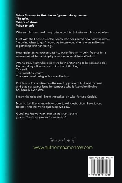 When it comes to life's fun and games, always know: The rules. What's at stake. When to quit. Wise words from...well...my fortune cookie. But wise words, nonetheless. I just wish the Fortune Cookie People had considered how hard the whole "knowing when to quit" would be to carry out when a woman like me is gambling with her feelings. Heart-palpitating, vageen-tingling, butterflies-in-my-belly feelings for a noncommittal, hot-as-sin player by the name of Jude Winslow. After a crazy night where we were both pretending to be someone else, I've found myself immersed in the fun of the fling. The thrill. The irresistible charm. The pleasure of being with a man like him. Problem is, I'm positive he's the exact opposite of husband material, and that is a serious issue for someone who is fixated on finding her happily ever after. I know the rules and I know the stakes, oh wise Fortune Cookie. Now I'd just like to know how close to self-destruction I have to get before I find the will to quit Jude Winslow. Goodness knows, when your heart is on the line, you can't ante up your bet with an IOU.