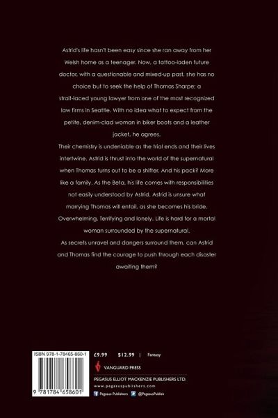Astrid's life hasn't been easy since she ran away from her Welsh home as a teenager. Now, a tattoo-laden future doctor, with a questionable and mixed-up past, she has no choice but to seek the help of Thomas Sharpe; a strait-laced young lawyer from one of the most recognized law firms in Seattle. With no idea what to expect from the petite, denim-clad woman in biker boots and a leather jacket, he agrees. Their chemistry is undeniable as the trial ends and their lives intertwine. Astrid is thrust into the world of the supernatural when Thomas turns out to be a shifter. And his pack? More like a family. As the Beta, his life comes with responsibilities not easily understood by Astrid. Astrid is unsure what marrying Thomas will entail, as she becomes his bride. Overwhelming. Terrifying and lonely. Life is hard for a mortal woman surrounded by the supernatural. As secrets unravel and dangers surround them, can Astrid and Thomas find the courage to push through each disaster awaiting them?