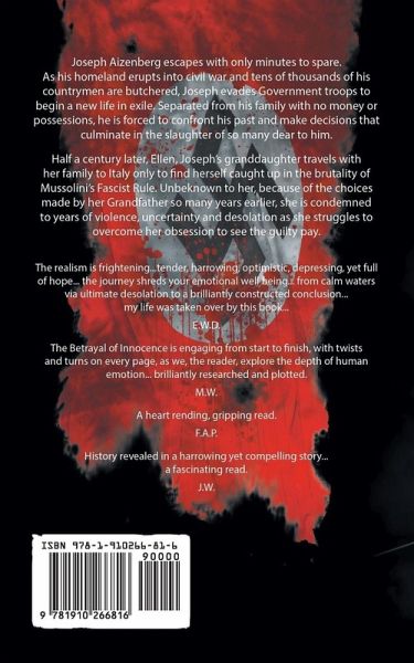 Joseph Aizenberg escapes with only minutes to spare. As his homeland erupts into civil war and tens of thousands of his countrymen are butchered, Joseph evades Government troops to begin a new life in exile. Separated from his family with no money or possessions, he is forced to confront his past and make decisions that culminate in the slaughter of so many dear to him. Half a century later, Ellen, Joseph's granddaughter travels with her family to Italy only to find herself caught up in the brutality of Mussolini's Fascist Rule. Unbeknown to her, because of the choices made by her Grandfather so many years earlier, she is condemned to years of violence, uncertainty and desolation as she struggles to overcome her obsession to see the guilty pay. The realism is frightening...tender, harrowing, optimistic, depressing, yet full of hope... the journey shreds your emotional well being... from calm waters via ultimate desolation to a brilliantly constructed conclusion... my life was taken over by this book... E.W.D. The Betrayal of Innocence is engaging from start to finish, with twists and turns on every page, as we, the reader, explore the depth of human emotion... brilliantly researched and plotted. M.W. A heart rending, gripping read. F.A.P. History revealed in a harrowing yet compelling story... a fascinating read. J.W.