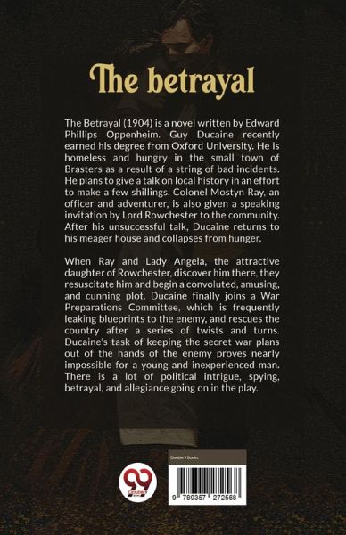 The Betrayal (1904) is a novel written by Edward Phillips Oppenheim. Guy Ducaine recently earned his degree from Oxford University. He is homeless and hungry in the small town of Brasters as a result of a string of bad incidents. He plans to give a talk on local history in an effort to make a few shillings. Colonel Mostyn Ray, an officer and adventurer, is also given a speaking invitation by Lord Rowchester to the community. After his unsuccessful talk, Ducaine returns to his meager house and collapses from hunger. When Ray and Lady Angela, the attractive daughter of Rowchester, discover him there, they resuscitate him and begin a convoluted, amusing, and cunning plot. Ducaine finally joins a War Preparations Committee, which is frequently leaking blueprints to the enemy, and rescues the country after a series of twists and turns. Ducaine's task of keeping the secret war plans out of the hands of the enemy proves nearly impossible for a young and inexperienced man. There is a lot of political intrigue, spying, betrayal, and allegiance going on in the play.