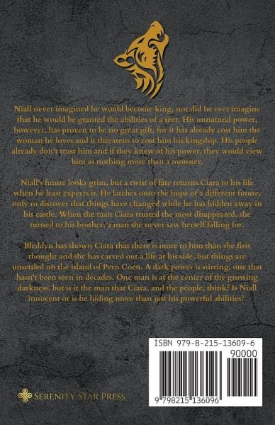 A broken warrior. A broody outcast king. And a darkness that threatens to destroy them both. Niall never imagined he would become king, nor did he ever imagine that he would be granted the abilities of a seer. His unnatural power, however, has proven to be no great gift, for it has already cost him the woman he loves and it threatens to cost him his kingship. His people already don't trust him and if they knew of his power, they would view him as nothing more than a monster. Niall's future looks grim, but a twist of fate returns Ciara to his life when he least expects it. He latches onto the hope of a different future, only to discover that things have changed while he has hidden away in his castle. When the man Ciara trusted the most disappeared, she turned to his brother, a man she never saw herself falling for. Bleddyn has shown Ciara that there is more to him than she first thought and she has carved out a life at his side, but things are unsettled on the island of Pern Coen. A dark power is stirring, one that hasn't been seen in decades. One man is at the center of the growing darkness, but is it the man that Ciara, and the people, think? Is Niall innocent or is he hiding more than just his powerful abilities? This Celtic inspired romantic fantasy features strong world building, a broody outcast king, a broken warrior heroine, sibling rivalry, political intrigue, dark magic, found family, and low spice romance.