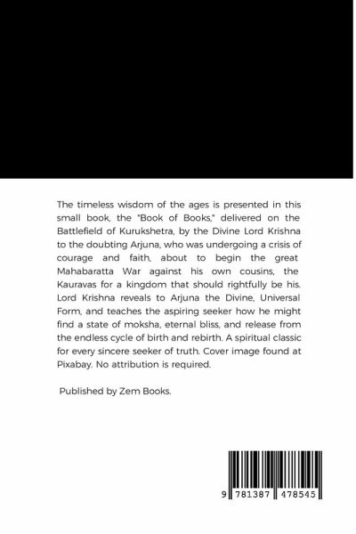 The timeless wisdom of the ages is presented in this small book, the "Book of Books," delivered on the Battlefield of Kurukshetra, by the Divine Lord Krishna to the doubting Arjuna, who was undergoing a crisis of courage and faith, about to begin the great Mahabaratta War against his own cousins, the Kauravas for a kingdom that should rightfully be his. Lord Krishna reveals to Arjuna the Divine, Universal Form, and teaches the aspiring seeker how he might find a state of moksha, eternal bliss, and release from the endless cycle of birth and rebirth. A spiritual classic for every sincere seeker of truth. Cover image found at Pixabay. No attribution is required. Published by Zem Books.