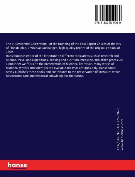 The Bi-Centennial Celebration - of the founding of the First Baptist Church of the city of Phialdelphia, 1898 is an unchanged, high-quality reprint of the original edition of 1899.