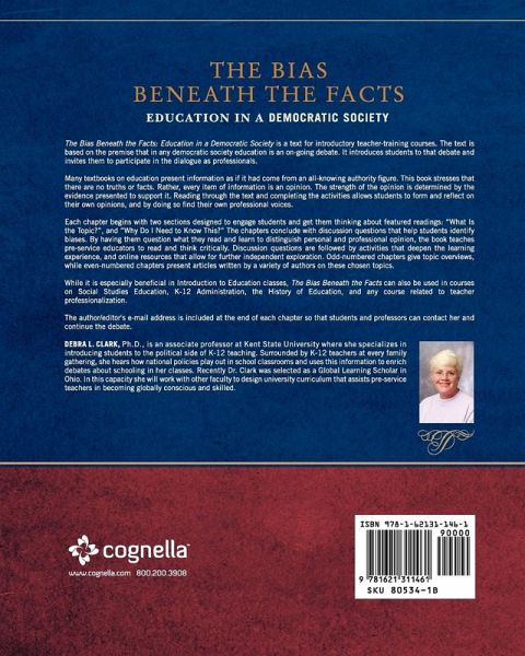 The Bias Beneath the Facts: Education in a Democratic Society is a text for introductory teacher-training courses. The text is based on the premise that in any democratic society education is an on-going debate. It introduces students to that debate and invites them to participate in the dialogue as professionals. Many textbooks on education present information as if it had come from an all-knowing authority figure. This book stresses that there are no truths or facts. Rather, every item of information is an opinion. The strength of the opinion is determined by the evidence presented to support it. Reading through the text and completing the activities allows students to form and reflect on their own opinions, and by doing so find their own professional voices. Each chapter begins with two sections designed to engage students and get them thinking about featured readings: "What Is the Topic?", and "Why Do I Need to Know This?" The chapters conclude with discussion questions that help students identify biases. By having them question what they read and learn to distinguish personal and professional opinion, the book teaches pre-service educators to read and think critically. Discussion questions are followed by activities that deepen the learning experience, and online resources that allow for further independent exploration. Odd-numbered chapters give topic overviews, while even-numbered chapters present articles written by a variety of authors on these chosen topics. While it is especially beneficial in Introduction to Education classes, The Bias Beneath the Facts can also be used in courses on Social Studies Education, K-12 Administration, the History of Education, and any course related to teacher professionalization. The author/editor's e-mail address is included at the end of each chapter so that students and professors can contact her and continue the debate. Debra L. Clark, Ph.D., is an associate professor at Kent State University where she specializes in introducing students to the political side of K-12 teaching. Surrounded by K-12 teachers at every family gathering, she hears how national policies play out in school classrooms and uses this information to enrich debates about schooling in her classes. Recently Dr. Clark was selected as a Global Learning Scholar in Ohio. In this capacity she will work with other faculty to design university curriculum that assists pre-service teachers in becoming globally conscious and skilled.