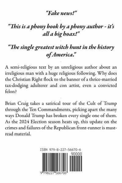 A semi-religious text by an unreligious author about an irreligious man with a huge religious following. Why does the Christian Right flock to the banner of a thrice-married tax-dodging adulterer and con artist? Brian Craig takes a satirical tour of the Cult of Trump through the Ten Commandments, picking apart the many ways Donald Trump has broken every single one of them. As the 2024 Election season heats up, this must-read update on the crimes and failures of the Republican front-runner is must-read material.
