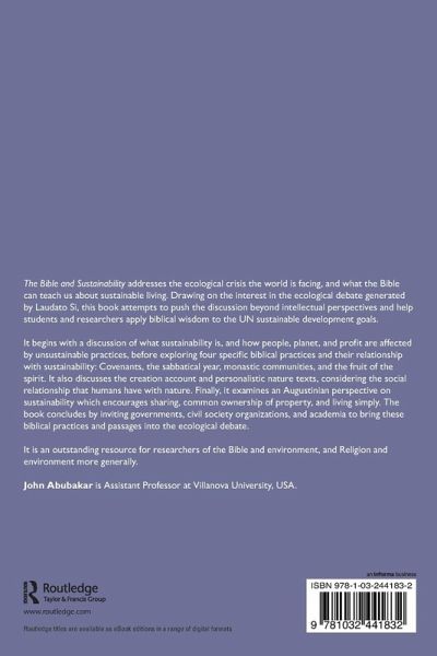 The Bible and Sustainability addresses the ecological crisis the world is facing, and what the Bible can teach us about sustainable living. Drawing on the interest in the ecological debate generated by Laudato Si, this book attempts to push the discussion beyond intellectual perspectives and help students and researchers apply biblical wisdom to the UN sustainable development goals.