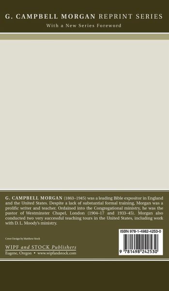 G. Campbell Morgan (1863-1945) was a leading Bible expositor in England and the United States. Despite a lack of substantial formal training, Morgan was a prolific writer and teacher. Ordained into the Congregational ministry, he was the pastor of Westminster Chapel, London (1904-17 and 1933-45). Morgan also conducted two very successful teaching tours in the United States, including work with D.L. Moody's ministry.
