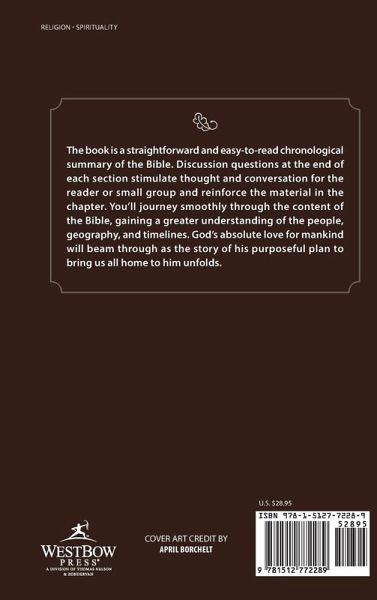 The book is a straightforward and easy-to-read chronological summary of the Bible. Discussion questions at the end of each section stimulate thought and conversation for the reader or small group and reinforce the material in the chapter. You'll journey smoothly through the content of the Bible, gaining a greater understanding of the people, geography, and timelines. God's absolute love for mankind will beam through as the story of his purposeful plan to bring us all home to him unfolds.