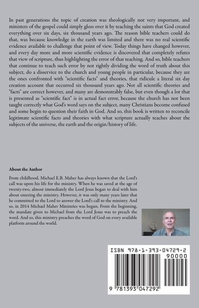 In past generations the topic of creation was theologically not very important, and ministers of the gospel could simply gloss over it by teaching the saints that God created everything over six days, six thousand years ago. The reason bible teachers could do that, was because knowledge in the earth was limited and there was no real scientific evidence available to challenge that point of view. Today things have changed however, and every day more and more scientific evidence is discovered that completely refutes that view of scripture, thus highlighting the error of that teaching. And so, bible teachers that continue to teach such error by not rightly dividing the word of truth about this subject, do a disservice to the church and young people in particular, because they are the ones confronted with "scientific facts" and theories, that ridicule a literal six day creation account that occurred six thousand years ago. Not all scientific theories and "facts" are correct however, and many are demonstrably false, but even though a lot that is presented as "scientific fact" is in actual fact error, because the church has not been taught correctly what God's word says on the subject, many Christians become confused and some begin to question their faith in God. And so, this book is written to reconcile legitimate scientific facts and theories with what scripture actually teaches about the subjects of the universe, the earth and the origin/history of life.