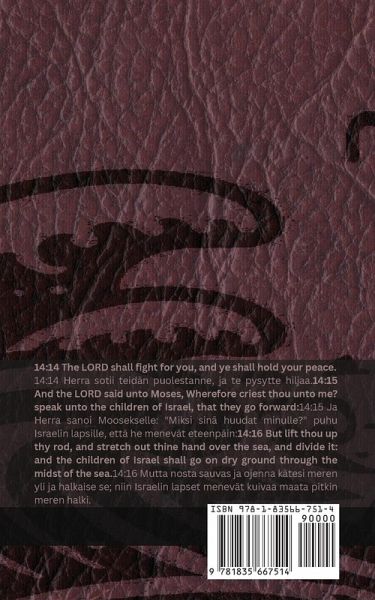15:1 Then sang Moses and the children of Israel this song unto the LORD, and spake, saying, I will sing unto the LORD, for he hath triumphed gloriously: the horse and his rider hath he thrown into the sea. 15:1 Ja Mooses ja israelilaiset lauloivat tämän laulun Herralle ja sanoivat: "Minä laulan Herralle, sillä hän on voittanut kunnian; hevosen ja ratsastajansa hän heitti mereen." 15:2 The LORD is my strength and song, and he is become my salvation: he is my God, and I will prepare him an habitation; my father's God, and I will exalt him. 15:2 Herra on minun väkevyyteni ja lauluni, ja hän on minun pelastukseni: hän on minun Jumalani, ja minä valmistan hänelle asumuksen. minun isäni Jumala, ja minä korotan hänet. 15:3 The LORD is a man of war: the LORD is his name. 15:3 Herra on sotamies, Herra on hänen nimensä. 15:4 Pharaoh's chariots and his host hath he cast into the sea: his chosen captains also are drowned in the Red sea. 15:4 Faraon vaunut ja sotajoukkonsa hän heitti mereen, ja hänen valitut päällikkönsä hukkuvat Punaiseen mereen. 15:5 The depths have covered them: they sank into the bottom as a stone. 15:5 Syvyydet ovat peittäneet heidät: he upposivat pohjaan kuin kivi. 15:6 Thy right hand, O LORD, is become glorious in power: thy right hand, O LORD, hath dashed in pieces the enemy. 15:6 Sinun oikea kätesi, oi Herra, on kirkastunut voimalla; sinun oikea kätesi, oi Herra, murskasi vihollisen
