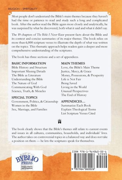 Most people don't understand the Bible's main themes because they haven't had the time or patience to read and study such a long and complicated book. After the author read the Bible again more closely and analytically, he was surprised by what he discovered, both what it said and what it didn't say. The 19 chapters of The Bible I Never Knew present facts about the Bible and its context and concise summaries of its major themes. The book relies on more than 6,000 scripture verses to illustrate the depth of what was written on the topics. This thematic approach helps readers gain a deeper and more comprehensive understanding of the scriptures. The book has three parts and a set of appendices. BASIC INFORMATION Bible History and Structure Important Missing Details The Bible as Literature Understanding the Bible The Nature of God Communicating With God Science, Truth, & Miracles MAIN THEMES Love, the Bible's Main Theme Justice, Mercy, & Grace Money, Possessions, & Prosperity Life is Not Fair Being Saved Living in the World Unusual Perspectives The End of History SPECIAL TOPICS Government, Politics, & Citizenship Women in the Bible Sex, Marriage, and Families APPENDICES... Summarize Each Book Explain Theological Terms List Scripture Verses Cited The book clearly shows that the Bible's themes still relate to current events and issues in all cultures, communities, households, and individuals' lives. The author takes on controversial topics in a balanced way and does not take a position on them - he lets the scriptures speak for themselves.