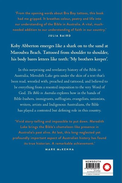 Koby Abberton emerges like a shark on to the sand at Maroubra Beach. Tattooed from shoulder to shoulder, his body bares letters like teeth: 'My brothers keeper'. In this surprising and revelatory history of the Bible in Australia, Meredith Lake gets under the skin of a text that's been read, wrestled with, preached and tattooed, and believed to be everything from a resented imposition to the very Word of God. The Bible in Australia explores how in the hands of Bible-bashers, immigrants, suffragists, evangelists, unionists, writers, artists and Indigenous Australians, the Bible has played a contested but defining role in this country.