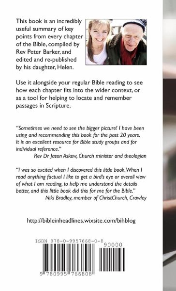 This book, compiled by Rev Peter Barker and edited and re-published by his daughter, Helen Barker, is an extremely useful summary of key points from each chapter of the Bible in a one- or two-line "headline". It began life as a result of Peter's personal discipline of Bible study and memorization. He discovered the benefit of becoming familiar with the books of the Bible, and the stories and truths contained in them. As a great expounder and evangelist, he knew the importance of memorizing scripture and knowing how to find passages in the Bible. There is no substitute for reading the Bible itself - the intention of this book is simply to be a tool to help you locate, learn and remember scripture, so that you may gain a richer knowledge of God and His Word.