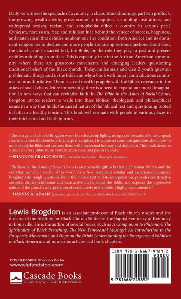 Daily we witness the spectacle of a country in chaos. Mass shootings, partisan gridlock, the growing wealth divide, gross economic inequities, crumbling institutions, and widespread sexism, racism, and xenophobia reflect a country in serious peril. Cynicism, narcissism, fear, and nihilism hide behind the veneer of success, happiness, and materialism that deludes us about our dire condition. Both America and its dominant religion are in decline and more people are raising serious questions about God, the church, and its sacred text for the role they play in past and present realities unfolding around us. This is especially true in the African American community where there are grassroots movements and emerging leaders questioning traditional beliefs of the Black church. Today, millennials and Gen Z youth question problematic things said in the Bible and why a book with moral contradictions continues to be authoritative. There is a real need to grapple with the Bible's relevance in the ashes of social chaos. More importantly, there is a need to expand our moral imagination in new ways that can revitalize faith. In The Bible in the Ashes of Social Chaos, Brogdon invites readers to wade into these biblical, theological, and philosophical issues in a way that holds the sacred nature of the biblical text and questioning rooted in faith in a healthy tension. This book will resonate with people in various places in their intellectual and faith journey.