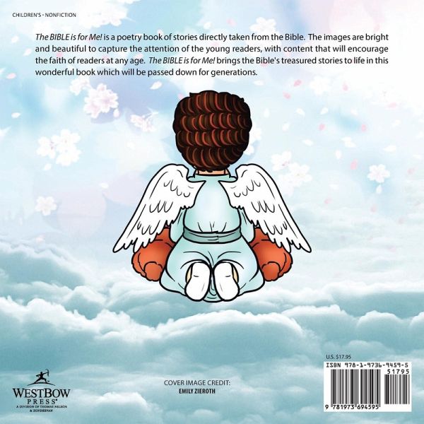 The BIBLE is for Me! is a poetry book of stories directly taken from the Bible. The images are bright and beautiful to capture the attention of the young readers, with content that will encourage the faith of readers at any age. The BIBLE is for Me! brings the Bible's treasured stories to life in this wonderful book which will be passed down for generations.