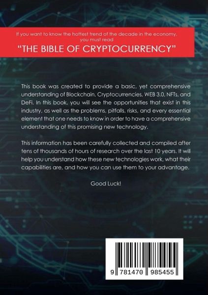 The Bible of Cryptocurrency is the go-to guide for everything related to digital currency. It covers everything from the basics of Bitcoin to more advanced topics like farming and blockchain technology. Whether you're a beginner or an expert, this book has something for you. If you want to get started in the world of cryptocurrency, this is the book for you. Learn about the hottest trends in the space and how to get involved. Blockchain, Bitcoin, Ethereum, NFTs, DeFi, Web3, meme coins, wallets, exchanges, platforms, farming, minting, many other cryptocurrencies, and more are all covered in-depth, with clear explanations. Check out various investment methods to determine which method is right for you depending on your investment goals, risk tolerance, and time horizon. Learn how to buy cryptocurrency or NFTs and ways to invest in them. Find out which coins are worth your investment and avoid the pitfalls. Discover the power of decentralization, the potential of cryptocurrency and Web3, and how they can change the world. And much more! The book is written in aneasy-to-understand stylethat makes it perfect for beginners. It also includes aGlossary of termsfor those who are unfamiliar with the jargon. Most importantly, it provides readers with a solid foundation on which to make informed decisions about investing in cryptocurrency. The Bible of Cryptocurrency is an essential read for anyone serious about thehottest financial trend of this centuryin this rapidly growing space. WithThe Bible of Cryptocurrency, you'll have everything you need to jump into this exciting world with confidence.