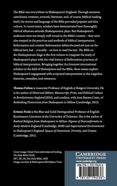 The Bible was everywhere in Shakespeare's England. Through sermons, catechisms, treatises, artwork, literature and, of course, biblical reading itself, the stories and language of the Bible pervaded popular and elite culture. In recent years, scholars have demonstrated how thoroughly biblical allusions saturate Shakespearean plays. But Shakespeare's audiences were not simply well versed in the Bible's content - they were also steeped in the practices and methods of biblical interpretation. Reformation and counter-reformation debate focused not just on the biblical text, but - crucially - on how to read the text. The Bible on the Shakespearean Stage is the first volume to integrate the study of Shakespeare's plays with the vital history of Reformation practices of biblical interpretation. Bringing together the foremost international scholars in the field of 'Shakespeare and the Bible', these essays explore Shakespeare's engagement with scriptural interpretation in the tragedies, histories, comedies, and romances.