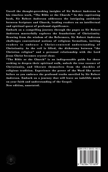 Unveil the thought-provoking insights of Sir Robert Anderson in his timeless work, "The Bible or the Church." In this captivating book, Sir Robert Anderson addresses the intriguing antithesis between Scripture and Church, leading readers on an intellectual and spiritual quest of profound significance.Embark on a compelling journey through the pages as Sir Robert Anderson masterfully explores the foundations of Christianity. Drawing from the wisdom of the Reformers, Sir Robert Anderson challenges conventional notions of religious formalism, inviting readers to embrace a Christ-centered understanding of Christianity. As the veil is lifted, the dichotomy between "the Christian religion" and a personal relationship with the Lord Jesus Christ becomes crystal clear."The Bible or the Church" is an indispensable guide for those seeking to deepen their spiritual walk, unlock the true essence of Christianity, and liberate themselves from the shackles of religious tradition. Experience the power of the Word like never before as you embrace the profound truths unveiled by Sir Robert Anderson. Embark on a journey that will leave an indelible mark on your faith and understanding of the Gospel.New edition, annotated.