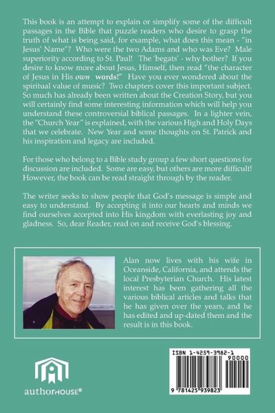 This book is an attempt to explain or simplify some of the difficult passages in the Bible that puzzle readers who desire to grasp the truth of what is being said, for example, what does this mean - "in Jesus' Name"? Who were the two Adams and who was Eve? Male superiority according to St. Paul! The 'begats' - why bother? If you desire to know more about Jesus, Himself, then read "the character of Jesus in His own words! Have you ever wondered about the spiritual value of music? Two chapters cover this important subject. So much has already been written about the Creation Story, but you will certainly find some interesting information which will help you understand these controversial biblical passages. In a lighter vein, the "Church Year" is explained, with the various High and Holy Days that we celebrate. New Year and some thoughts on St. Patrick and his inspiration and legacy are included. For those who belong to a Bible study group a few short questions for discussion are included. Some are easy, but others are more difficult! However, the book can be read straight through by the reader. The writer seeks to show people that God's message is simple and easy to understand. By accepting it into our hearts and minds we find ourselves accepted into His kingdom with everlasting joy and gladness. So, dear Reader, read on and receive God's blessing.