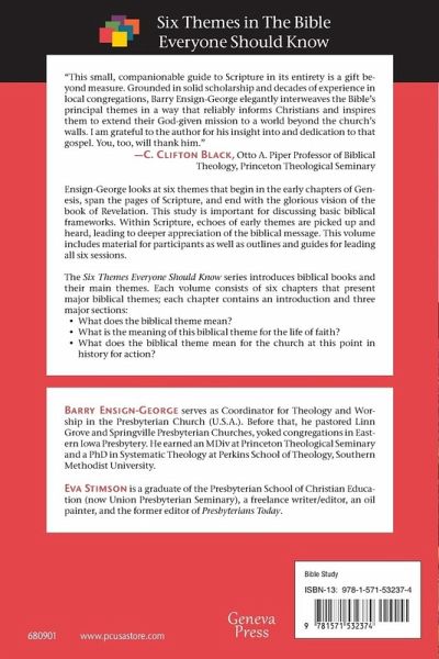 Ensign-George looks at six themes that begin in the early chapters of Genesis, span the pages of Scripture, and end with the glorious vision of the book of Revelation. This study is important for discussing basic biblical frameworks. Within Scripture, echoes of early themes are picked up and heard, leading to deeper appreciation of the biblical message. The Six Themes Everyone Should Know series introductes biblical books and their main themes. Each volume consists of six chapters that present major biblical themes; each chapter contains an introduction and three major sections: What does the biblical theme mean? What is the meaning of this biblical theme for the life of faith? What does the biblical theme mean for the church at this point in history for action?