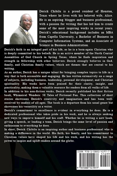 Derick Chibilu is a proud resident of Houston, Texas where he lives with his beloved wife, Alice. He is an aspiring blogger and business professional, with a passion for writing that has led him to create some of the most inspiring works in recent years. Derick's educational background includes an MBA from Capella University, a Bachelor of Business in Computer Information Systems from the University of Houston Downtown (UHD), and an Associate of Science in Business Administration from Delaware Tech.Derick's faith is an integral part of his life, as he is a born-again Christian who is deeply committed to his beliefs. He is an active member of the North Central Assemblies of God Church in Spring Texas, where he finds inspiration and strength in fellowship with other believers. Derick strongly believes in God, family, and Christian family values, which are themes that are central to his writing.As an author, Derick has a unique talent for bringing complex topics to life in a way that is both accessible and engaging. He has written extensively on a range of subjects, including business, leadership, personal development, and Christian spirituality. His works have been praised for their clarity, insight, and practicality, making them a valuable resource for readers from all walks of life. Derick Chibilu recently published "Love As God Intended It" a must-read Christian-themed book based on 1 Corinthians 13In addition to his non-fiction works, Derick recently published his first fiction book, Whimsical Wonders: 50 Tales of Fictional Fun. This collection of short stories showcases Derick's creativity and imagination and has been well-received by readers of all ages. The book is a departure from his usual genre but showcases his versatility as a writer.Derick's commitment to excellence is evident in everything he does. He is a dedicated professional who takes pride in his work, and he is always seeking new ways to improve himself and his craft. Whether he is writing a new book, giving a speech, or leading a team, Derick brings the same level of passion and enthusiasm to everything he does.In short, Derick Chibilu is an inspiring author and business professional who is making a difference in the world. His faith, his family, and his commitment to Christian values have shaped his life and his work, and his writing has the power to inspire and uplift readers around the globe.