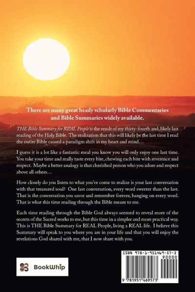 There are many great heady scholarly Bible Commentaries and Bible Summaries widely available. THE Bible Summary for REAL People is the result of my thirty-fourth and, likely last reading of the Holy Bible. The realization that this will likely be the last time I read the entire Bible caused a paradigm shift in my heart and mind… I guess it is a lot like a fantastic meal you know you will only enjoy one last time. You take your time and really taste every bite, chewing each bite with reverence and respect. Maybe a better analogy is that cherished person who you adore and respect above all others… How closely do you listen to what you've come to realize is your last conversation with that treasured soul? One last conversation, every word sweeter than the last. That is the conversation you savor and remember forever, hanging on every word. That is what this time reading through the Bible meant to me. Each time reading through the Bible God always seemed to reveal more of the secrets of the Sacred works to me, but this time in a simpler and more practical way. This is THE Bible Summary for REAL People, living a REAL life. I believe this Summary will speak to you where you are in your life and that you will enjoy the revelations God shared with me, that I now share with you.
