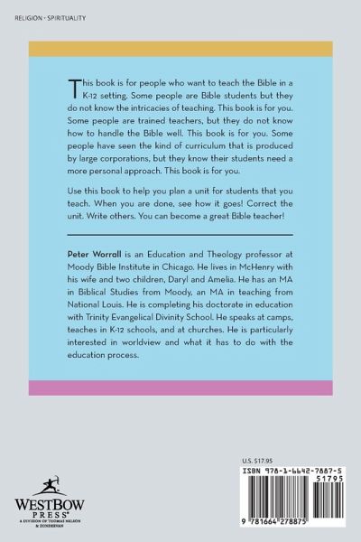 This book is for people who want to teach the Bible in a K-12 setting. Some people are Bible students but they do not know the intricacies of teaching. This book is for you. Some people are trained teachers, but they do not know how to handle the Bible well. This book is for you. Some people have seen the kind of curriculum that is produced by large corporations, but they know their students need a more personal approach. This book is for you. Use this book to help you plan a unit for students that you teach. When you are done, see how it goes! Correct the unit. Write others. You can become a great Bible teacher!