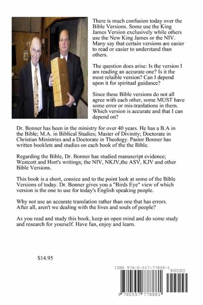 This book is condensed from several years of work by Dr. Charles Bonner. It briefly explores the various Versions of the Bible and their accuracy. It saves the reader hours and hours of study and makes it easier to have the information at your finger tips. Dr. Bonner has been in the ministry over 40 years. He has a B.A. in Bible; M.A. Biblical Studies, MDiv, DrMin, ThD. He has written other books, booklets and practical Bible Studies. You will learn and gain valuable knowledge about the various Bible Versions.