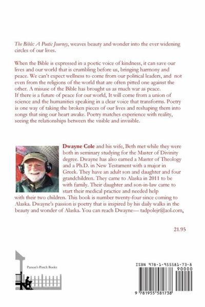 The Bible: A Poetic Journey, weaves beauty and wonder into the ever widening circles of our lives. When the Bible is expressed in a poetic voice of kindness, it can save our lives and our world that is crumbling before us, bringing harmony and peace. We can't expect wellness to come from our political leaders, and not even from the religions of the world that are often pitted one against the other. A misuse of the Bible has brought us as much war as peace. If there is a future of peace for our world, It will come from a union of science and the humanities speaking in a clear voice that transforms. Poetry is one way of taking the broken pieces of our lives and reshaping them into songs that sing our heart awake. Poetry matches experience with reality, seeing the relationships between the visible and invisible. Dwayne Cole and his wife, Beth met while they were both in seminary studying for the Master of Divinity degree. Dwayne has also earned a Master of Theology and a Ph.D. in New Testament with a major in Greek. They have an adult son and daughter and four grandchildren. They came to Alaska in 2011 to be with family. Their daughter and son-in-law came to start their medical practice and needed help with their two children. This book is number twenty-four since coming to Alaska. Dwayne's passion is poetry that is inspired by his daily walks in the beauty and wonder of Alaska. You can reach Dwayne- tadpolejr@aol.com.