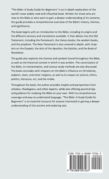 "The Bible: A Study Guide for Beginners" is an in-depth exploration of the world's most widely read and influential book. Written for those who are new to the Bible or who want to gain a deeper understanding of its contents, this guide provides a comprehensive overview of the Bible's history, themes, and significance. The book begins with an introduction to the Bible, including its origins and the different versions and translations available. It then delves into the Old Testament, including the Pentateuch, the history books, the wisdom books, and the prophets. The New Testament is also covered in depth, with chapters on the Gospels, the Acts of the Apostles, the Epistles, and the Book of Revelation. The guide also explores the themes and symbols found throughout the Bible, as well as the historical context in which it was written. The canonization of the Bible, its interpretation, and various study methods are also discussed. The book concludes with chapters on the Bible's influence on Christianity, Judaism, Islam, and other religions, as well as its impact on science, ethics, politics, literature, art, and the media. Throughout the book, the author provides insights and perspectives from scholars, theologians, and other experts, while also offering practical tips and guidance for studying the Bible on your own. With its comprehensive coverage and easy-to-understand language, "The Bible: A Study Guide for Beginners" is an essential resource for anyone interested in gaining a deeper understanding of this ancient and enduring text.