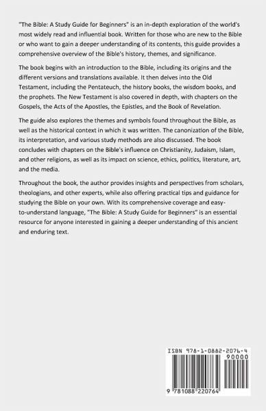 "The Bible: A Study Guide for Beginners" is an in-depth exploration of the world's most widely read and influential book. Written for those who are new to the Bible or who want to gain a deeper understanding of its contents, this guide provides a comprehensive overview of the Bible's history, themes, and significance. The book begins with an introduction to the Bible, including its origins and the different versions and translations available. It then delves into the Old Testament, including the Pentateuch, the history books, the wisdom books, and the prophets. The New Testament is also covered in depth, with chapters on the Gospels, the Acts of the Apostles, the Epistles, and the Book of Revelation. The guide also explores the themes and symbols found throughout the Bible, as well as the historical context in which it was written. The canonization of the Bible, its interpretation, and various study methods are also discussed. The book concludes with chapters on the Bible's influence on Christianity, Judaism, Islam, and other religions, as well as its impact on science, ethics, politics, literature, art, and the media. Throughout the book, the author provides insights and perspectives from scholars, theologians, and other experts, while also offering practical tips and guidance for studying the Bible on your own. With its comprehensive coverage and easy-to-understand language, "The Bible: A Study Guide for Beginners" is an essential resource for anyone interested in gaining a deeper understanding of this ancient and enduring text.