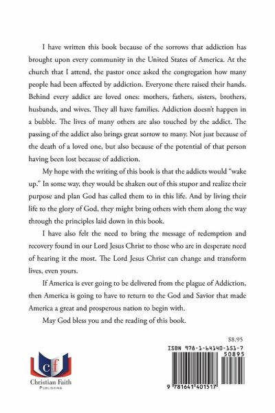 I have written this book because of the sorrows that addiction has brought upon every community in the United States of America. At the church that I attend, the pastor once asked the congregation how many people had been affected by addiction. Everyone there raised their hands. Behind every addict are loved ones: mothers, fathers, sisters, brothers, husbands, and wives. They all have families. Addiction doesn't happen in a bubble. The lives of many others are also touched by the addict. The passing of the addict also brings great sorrow to many. Not just because of the death of a loved one, but also because of the potential of that person having been lost because of addiction. My hope with the writing of this book is that the addicts would "wake up." In some way, they would be shaken out of this stupor and realize their purpose and plan God has called them to in this life. And by living their life to the glory of God, they might bring others with them along the way through the principles laid down in this book. I have also felt the need to bring the message of redemption and recovery found in our Lord Jesus Christ to those who are in desperate need of hearing it the most. The Lord Jesus Christ can change and transform lives, even yours. If America is ever going to be delivered from the plague of Addiction, then America is going to have to return to the God and Savior that made America a great and prosperous nation to begin with. May God bless you and the reading of this book.