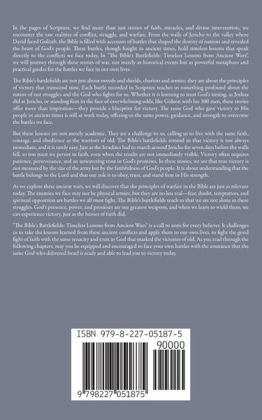 In the pages of Scripture, we find more than just stories of faith, miracles, and divine intervention; we encounter the raw realities of conflict, struggle, and warfare. From the walls of Jericho to the valley where David faced Goliath, the Bible is filled with accounts of battles that shaped the destiny of nations and revealed the heart of God's people. These battles, though fought in ancient times, hold timeless lessons that speak directly to the conflicts we face today. In "The Bible's Battlefields: Timeless Lessons from Ancient Wars", we will journey through these stories of war, not merely as historical events but as powerful metaphors and practical guides for the battles we face in our own lives. The Bible's battlefields are not just about swords and shields, chariots and armies; they are about the principles of victory that transcend time. Each battle recorded in Scripture teaches us something profound about the nature of our struggles and the God who fights for us. Whether it is learning to trust God's timing, as Joshua did at Jericho, or standing firm in the face of overwhelming odds, like Gideon with his 300 men, these stories offer more than inspiration-they provide a blueprint for victory. The same God who gave victory to His people in ancient times is still at work today, offering us the same power, guidance, and strength to overcome the battles we face. But these lessons are not merely academic. They are a challenge to us, calling us to live with the same faith, courage, and obedience as the warriors of old. The Bible's battlefields remind us that victory is not always immediate, and it is rarely easy. Just as the Israelites had to march around Jericho for seven days before the walls fell, so too must we persist in faith, even when the results are not immediately visible. Victory often requires patience, perseverance, and an unwavering trust in God's promises. In these stories, we see that true victory is not measured by the size of the army but by the faithfulness of God's people. It is about understanding that the battle belongs to the Lord and that our role is to obey, trust, and stand firm in His strength. As we explore these ancient wars, we will discover that the principles of warfare in the Bible are just as relevant today. The enemies we face may not be physical armies, but they are no less real-fear, doubt, temptation, and spiritual opposition are battles we all must fight. The Bible's battlefields teach us that we are not alone in these struggles. God's presence, power, and promises are our greatest weapons, and when we learn to wield them, we can experience victory, just as the heroes of faith did. "The Bible's Battlefields: Timeless Lessons from Ancient Wars" is a call to arms for every believer. It challenges us to take the lessons learned from these ancient conflicts and apply them to our own lives, to fight the good fight of faith with the same tenacity and trust in God that marked the victories of old. As you read through the following chapters, may you be equipped and encouraged to face your own battles with the assurance that the same God who delivered Israel is ready and able to lead you to victory today.