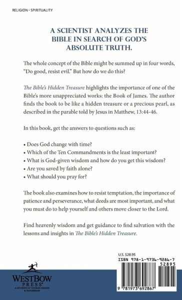 A SCIENTIST ANALYZES THE BIBLE IN SEARCH OF GOD'S ABSOLUTE TRUTH. The whole concept of the Bible might be summed up in four words, "Do good, resist evil." But how do we do this? The Bible's Hidden Treasure highlights the importance of one of the Bible's more unappreciated works: the Book of James. The author finds the book to be like a hidden treasure or a precious pearl, as described in the parable told by Jesus in Matthew, 13:44-46. In this book, get the answers to questions such as: Does God change with time? Which of the Ten Commandments is the least important? What is God-given wisdom and how do you get this wisdom? Are you saved by faith alone? What should you pray for? The book also examines how to resist temptation, the importance of patience and perseverance, what deeds are most important, and what you must do to help yourself and others move closer to the Lord. Find heavenly wisdom and get guidance to find salvation with the lessons and insights in The Bible's Hidden Treasure.