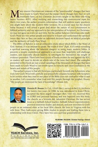 Many sincere Christians are unaware of the "questionable" changes that have been made to God's Word and the impact those changes have had, or will eventually have, on key Christian doctrines taught in the Bible (the King James Version-KJV). After studying and researching this controversial topic for thirty-two years, the author presents information that will address many questions you might have about the modern bible versions. It's a crucial issue for the church today because it will reveal a great deal about the nature of our commitment to biblical authority and our approach to the interpretation of Scripture. As Christians, we may not agree on every jot and tittle, but the author believes Christians who study God's Word are very astute people and deserve to know and understand the spiritual issues they face so they can make an informed decision based on biblical principle and the authority of God's Pure Word. The Bibles of Babylon is not an exhaustive study about which Bible is the Word of God. Instead, it is an attempt to speak "the truth in love" (Eph. 4:15) while sounding a spiritual warning about the inherent dangers in using many modern bibles. It presents a simple, nontechnical approach to an issue that, hopefully, will challenge readers, and especially church leaders, to investigate for themselves the weight of evidence presented. There have been scores of books written for and against the KJV, so readers will need to decide on which side of the issue they stand. The examples presented in this book are just a small sampling of the thousands of changes that have been made to God's Word to cast doubt upon its veracity and cause confusion in the hearts and minds of His people. The author's prayer is that all Christians, particularly Seventh-day Adventists, who truly love God's Word will carefully and prayerfully compare Scripture with Scripture to be certain what they read in one place of the Bible does not contradict what is said in another. Let's remember what God told His people through the prophet, Hosea: "My people are destroyed for lack of knowledge" (Hosea 4:6).