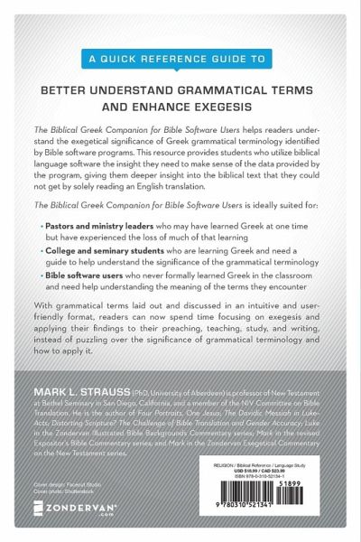 Provides students with simple and clear explanations of the grammatical terms they're likely to encounter in their Bible software of choice. While Bible language and exegetical programs provide users with lots of useful information, most of them unfortunately don't explain the basic meaning of the grammatical terminology or why that information is significant for understanding biblical texts. For most of us, it's been a long time since we've had any formal training in English grammar. So if you're using a Greek language program, and you come across grammatical terms like vocative, genitive, subjunctive, or middle voice--this is your quick index! To make this book as user-friendly as possible, each entry provides: A description of what the form looks like. A summary of what it does--its main functions (with examples from the Greek New Testament). An "Exegetical Insight" to show how understanding the grammar helps you interpret the text. The Biblical Greek Companion for Bible Software Users is ideally suited for: Pastors and ministry leaders who may have learned Greek at one time but have experienced the loss of much of that learning. College and seminary students who are learning Greek and need a guide to help understand the significance of the grammatical terminology. Bible software users who never formally learned Greek in the classroom and need help understanding the meaning of the terms they encounter. Any users of programs like Logos Bible Software, Accordance Bible Software, Olive Tree, or other Bible software programs who want a quick and easy reference. With grammatical terms laid out and discussed in an intuitive and user-friendly format, readers can now spend time focusing on exegesis and applying their findings to their preaching, teachings, study, and writing instead of puzzling over the significance of grammatical terminology and how to apply it.