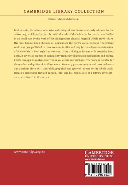Bibliomania, the almost obsessive collecting of rare books and early editions by the aristocracy, which peaked in 1812 with the sale of the Valdarfer Boccaccio, was fuelled in no small part by the work of the bibliographer Thomas Frognall Dibdin (1776-1847). His most famous book, Bibliomania, popularised the word's use in England. The present work was first published in three volumes in 1817 and may be considered a continuation of Bibliomania in both style and content. Using a dialogue format with extensive footnotes, it covers all aspects of bibliography from early illuminated manuscripts and printed books through to contemporary book collectors and auctions. The work is notable for the number and quality of its illustrations. Volume 3 presents accounts of book collectors and auctions since 1811, and bibliographical and general indexes to the whole work. Dibdin's Bibliomania (revised edition, 1811) and his Reminiscences of a Literary Life (1836) are also reissued in this series.