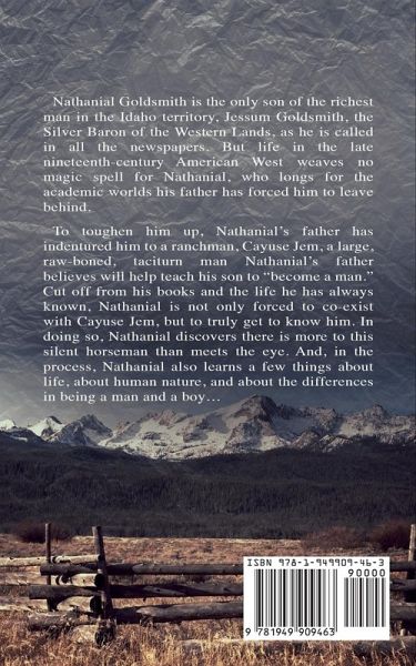 Nathanial Goldsmith is the only son of the richest man in the Idaho territory, Jessum Goldsmith, the Silver Baron of the Western Lands, as he is called in all the newspapers. But life in the late nineteenth-century American West weaves no magic spell for Nathanial, who longs for the academic worlds his father has forced him to leave behind. To toughen him up, Nathanial’s father has indentured him to a ranchman, Cayuse Jem, a large, raw-boned, taciturn man Nathanial’s father believes will help teach his son to "become a man." Cut off from his books and the life he has always known, Nathanial is not only forced to co-exist with Cayuse Jem, but to truly get to know him. In doing so, Nathanial discovers there is more to this silent horseman than meets the eye. And, in the process, Nathanial also learns a few things about life, about human nature, and about the differences in being a man and a boy…