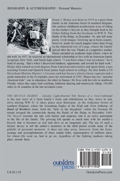 THE BICYCLE DIARIES - (Mostly) Light-Hearted War Stories of a Non-Combatant is the true story of a farm family's trials and tribulations as they strive to stay alive during WW II. It takes place near Bastogne, in the Ardennes forest of southern Belgium, where the Screaming Eagles of the 82nd and 101st Airborne, of Band of Brothers fame, held the "hole in the doughnut" while the German SS troops ravaged the countryside during the Battle of the Bulge in December 1944. The Bicycle recounts the tale with humor and suspense and is an active participant in the life of the family. The growing kid spends so much time with his mother' Bicycle that it becomes as real and alive as an imaginary pal. The use of such a literary device to tell the author's memories in the third person avoids many of the pitfalls of personal memoirs. It does not take away, however, from the fears, courage and accomplishments of these simple folks, representative of millions more, for whom life went on, had to go on, regardless of the fighting madness taking place around them.